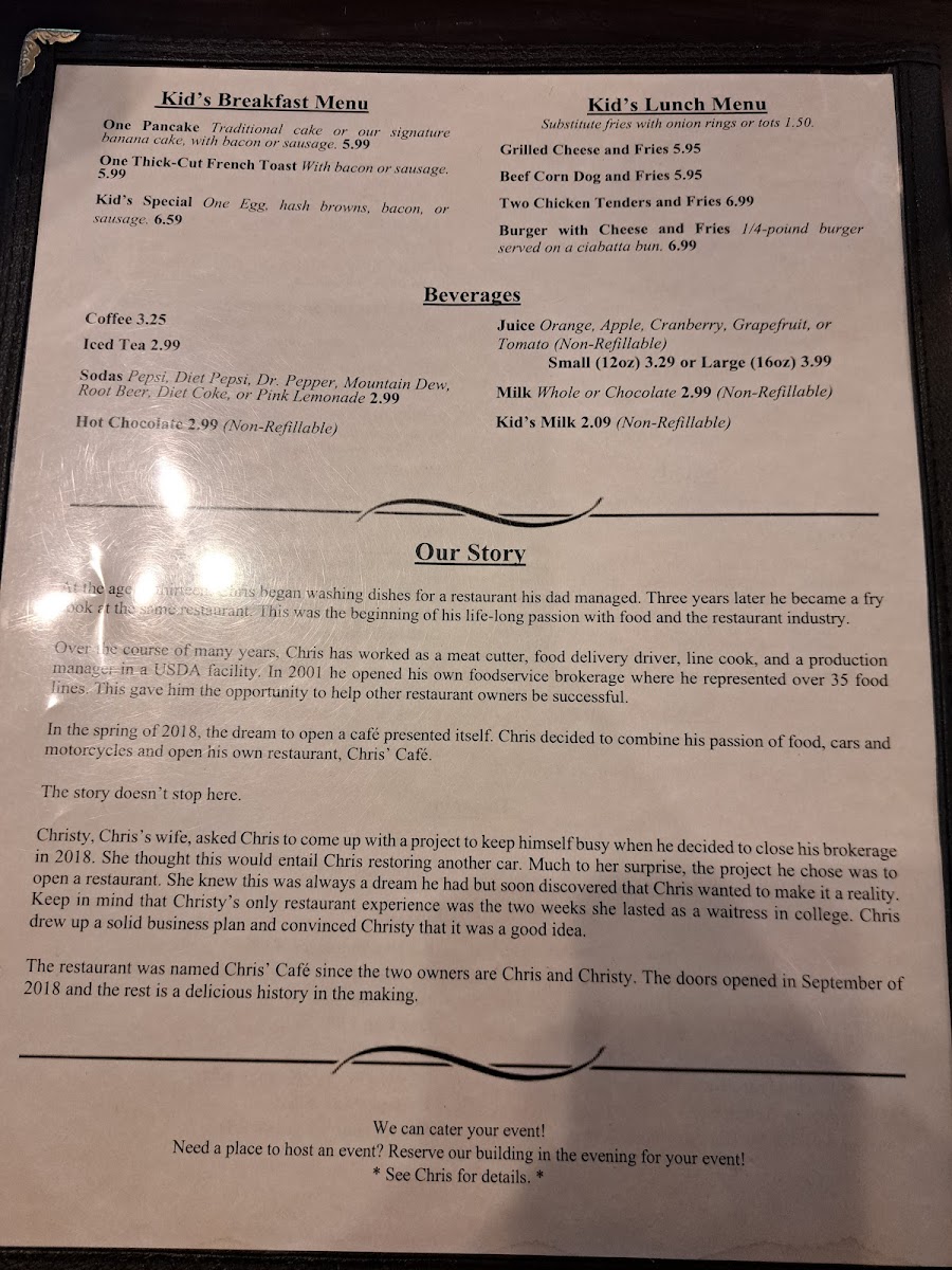 Customer reviews highlight the incredible breakfast offerings, from fluffy biscuits and gravy to outstanding peach crepe specials. With Chris himself involved and a commitment to quality, each dish reflects care and flavor. Experience a morning at Chris' Cafe—you’ll surely want to return!